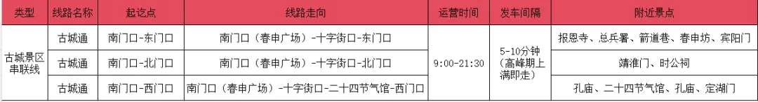 大年初一至初七期间,开行三条古城通旅游线路,实现与接驳线无缝衔接,带您深度漫游寿州古城。