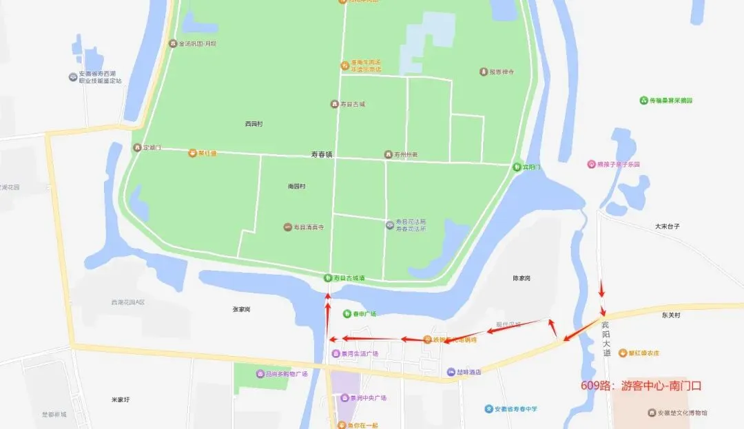 寿县高铁站、卧龙山、刘香豆腐小镇、翟家洼、省勘探一队、高速路口、东津渡、柏家台、二道坝、旅游集散中心、廉政文化园、宾阳小区、县医院东门、状元壹号、翰林首府、文化艺术中心、国投大厦、御景学府、寿滨小区、中医院、大圆盘、寿蔡路桥、南门公交枢纽、惠民花园、定湖花园、寿西湖小区、森林公园、技工学校、煤田一队、寿县高铁站