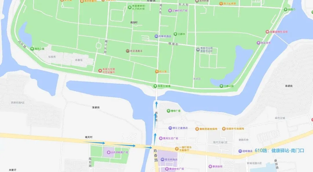 北门口、供电局、十字街口、棋盘街口、南门口、寿蔡路桥、南门公交枢纽、惠民花园、定湖花园、寿西湖小区、森林公园、技工学校、煤田一队、高铁站