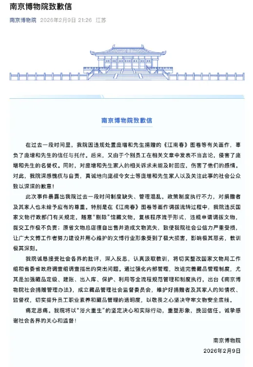 ●因违规处置庞增和先生捐赠的《江南春》图卷等有关画作,辜负了庞增和先生的信任与托付。南京博物院致歉:影响极其恶劣,教训极其深刻。