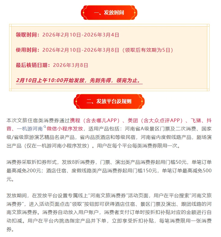 ●今天10点开抢!河南又一波消费券来了。河南省将于2月10日~3月8日面向全国游客发放2026年“乐享河南”新春文旅、住宿类消费券。门票、演出类产品消费券起用门槛50元,单笔订单最高减免200元;酒店住宿、度假线路类产品消费券起用门槛150元,单笔订单最高减免500元。