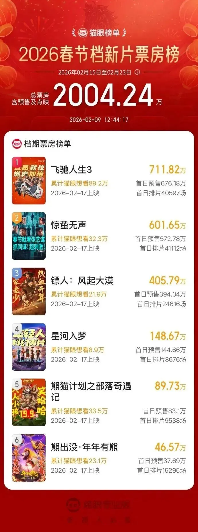 ●据猫眼专业版数据,2026年春节档新片预售总票房破2000万,《飞驰人生3》《惊蛰无声》《镖人:风起大漠》分列2026年春节档新片预售票房榜前三。