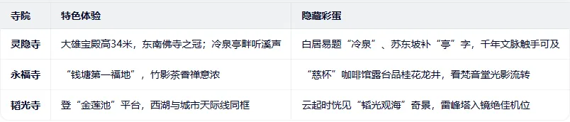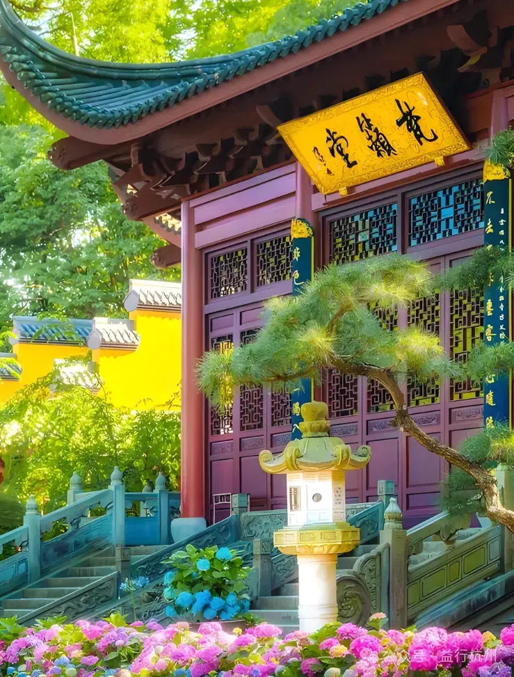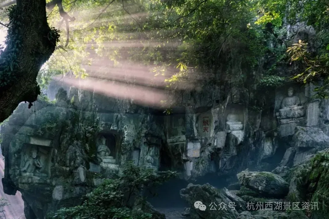 📸 出片机位▫️ 飞来峰弥勒佛前仰拍,笑容与山岩共暖▫️ 永福寺回廊竹影斜阳,光影如水墨流淌▫️ 韬光寺金莲池畔,西湖如镜,雷峰塔作簪