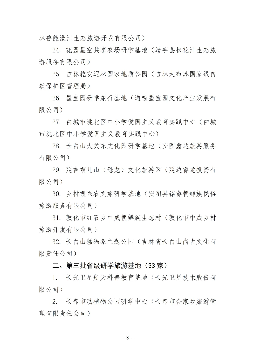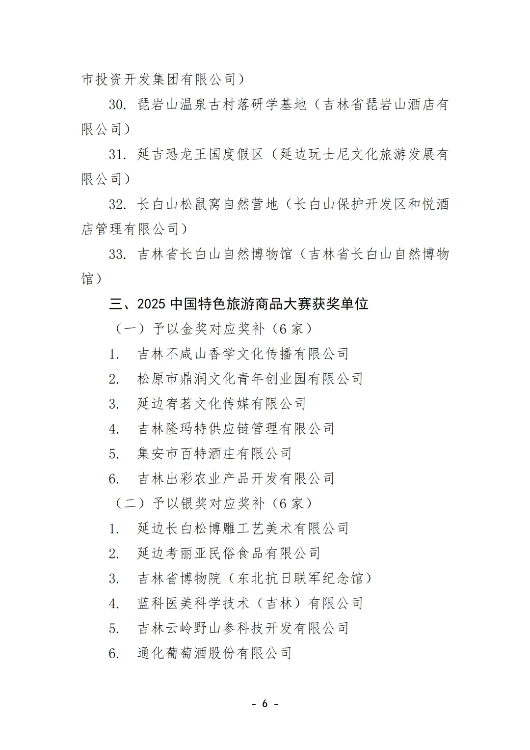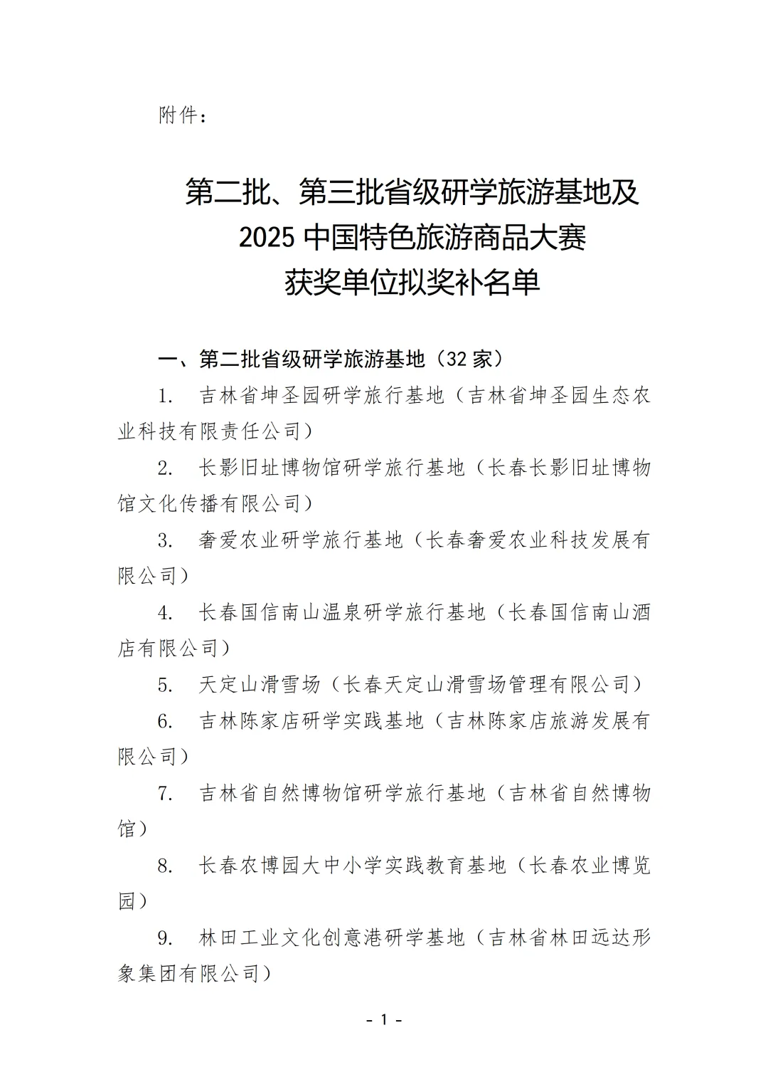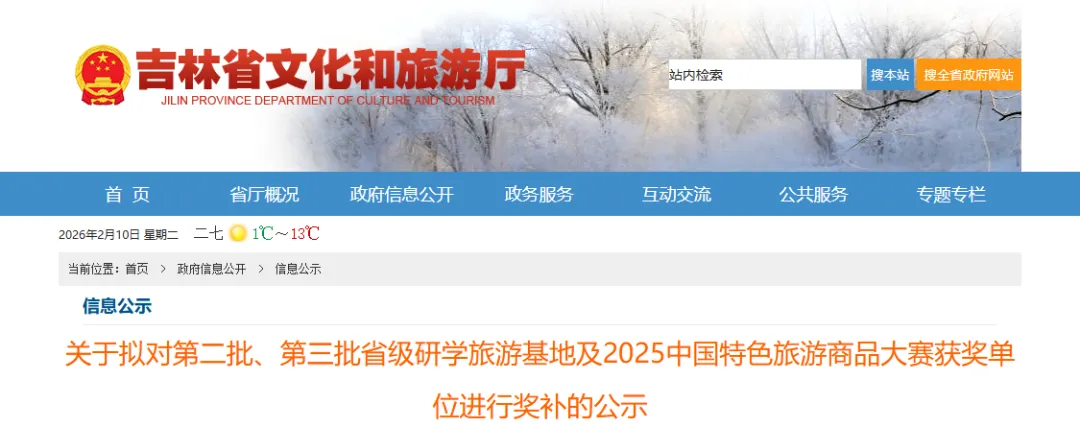 根据《吉林省文化和旅游厅关于印发<2026年度吉林省旅游和冰雪经济高质量发展专项资金项目申报指南>的通知》(吉文旅发〔2025〕305号)要求,按照《吉林省旅游和冰雪经济高质量发展专项资金管理办法》(吉财办〔2025〕383号)和《吉林省文化和旅游厅关于印发<吉林省扶持涉旅企业奖补细则>的通知》(吉文旅发〔2025〕303号),拟对第二批、第三批省级研学旅游基地和2025中国特色旅游商品大赛获奖单位进行奖补,现将名单予以公示。
