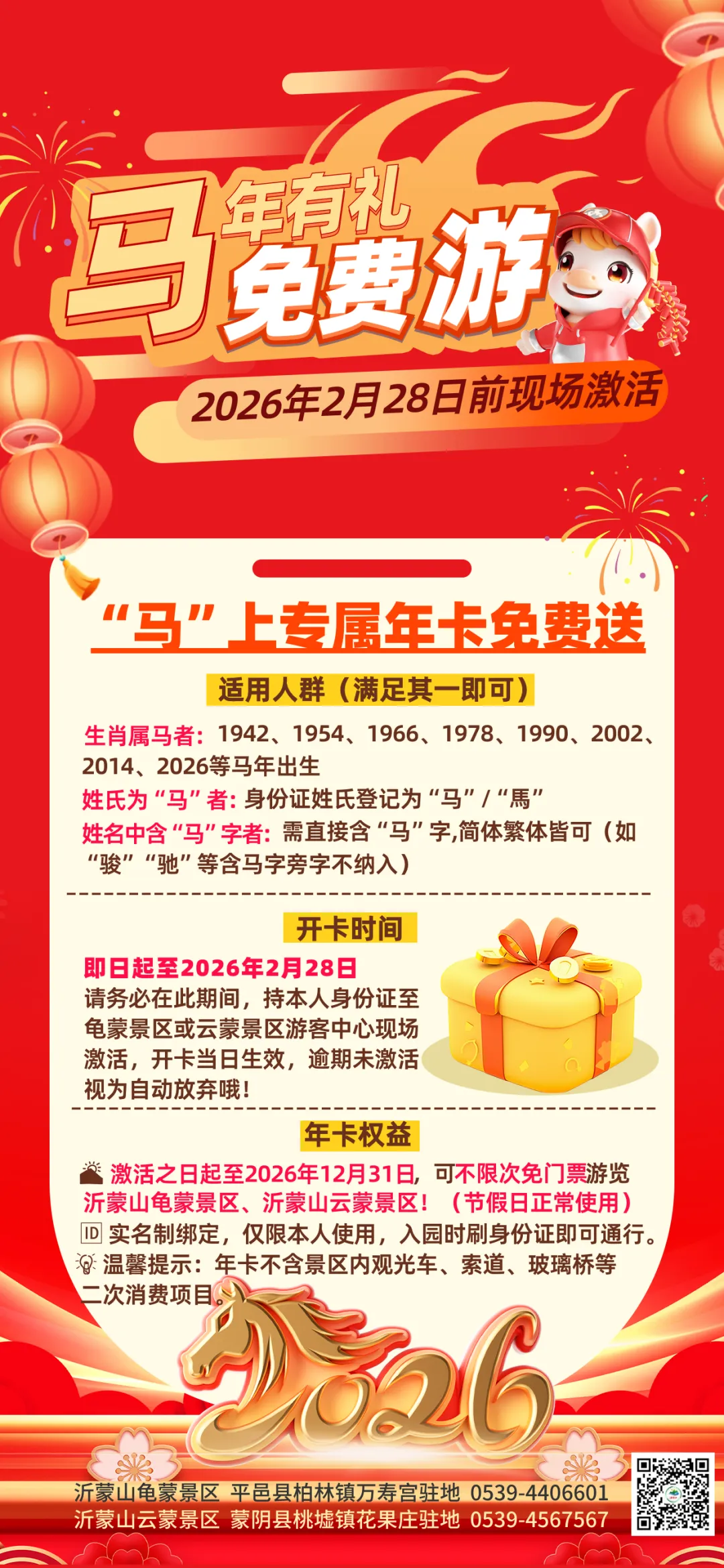 5. 属马、姓马及名字含“马”字游客,2026年2月28日前可凭本人有效身份证件,至景区游客中心免费办理2026蒙山旅游电子年卡,全年不限次免门票畅玩,超划算!