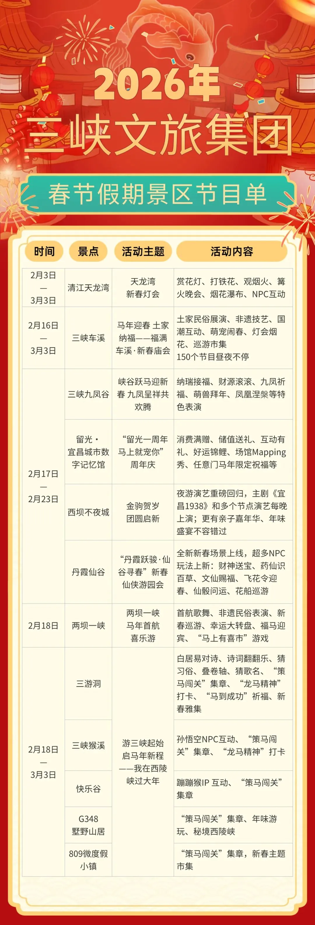 三峡文旅集团精心筹备、诚意满满,为八方游客烹制了一席集观赏、体验、文化于一体的新春文旅盛宴。