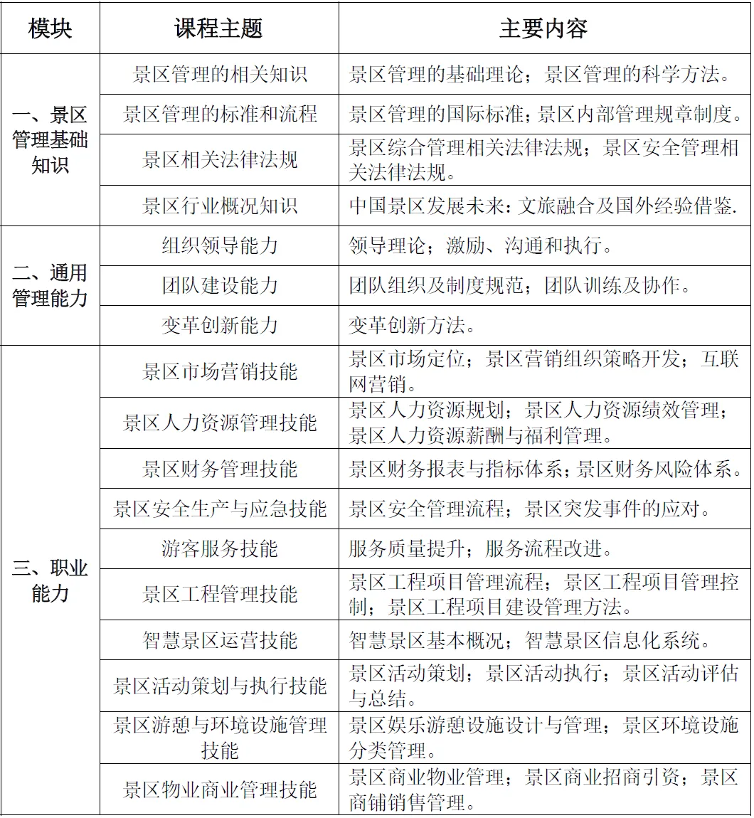 根据《景区职业经理人资质等级划分与评价》(T/CTAA0004-2021)标准及教材大纲要求,景区职业经理人资质须完成景区管理的基础知识、通用能力、职业技能三大模块的知识培训,本次培训班分为线上和线下两个阶段,即日起至2026年3月20日开展第一阶段线上课程培训;2026年3月24日至27日开展第二阶段线下课程及实践培训,计入继续教育48学时。对通过职业能力考核且考试合格的申请人员,由中国旅游景区协会和中国职业经理人协会联合颁发《景区职业经理人资质评价证书》,以此作为景区管理专业人员接受继续教育培训的证明。