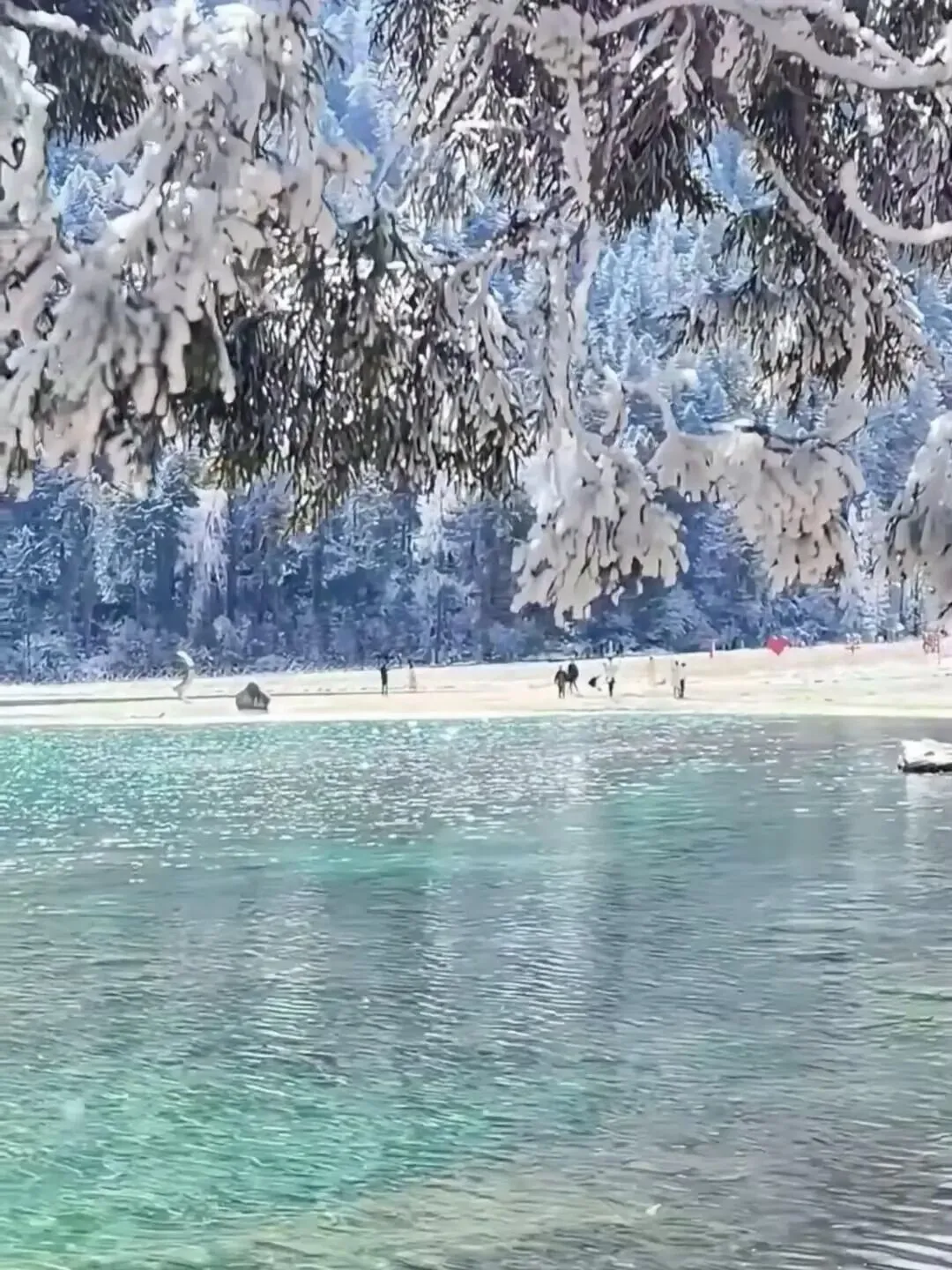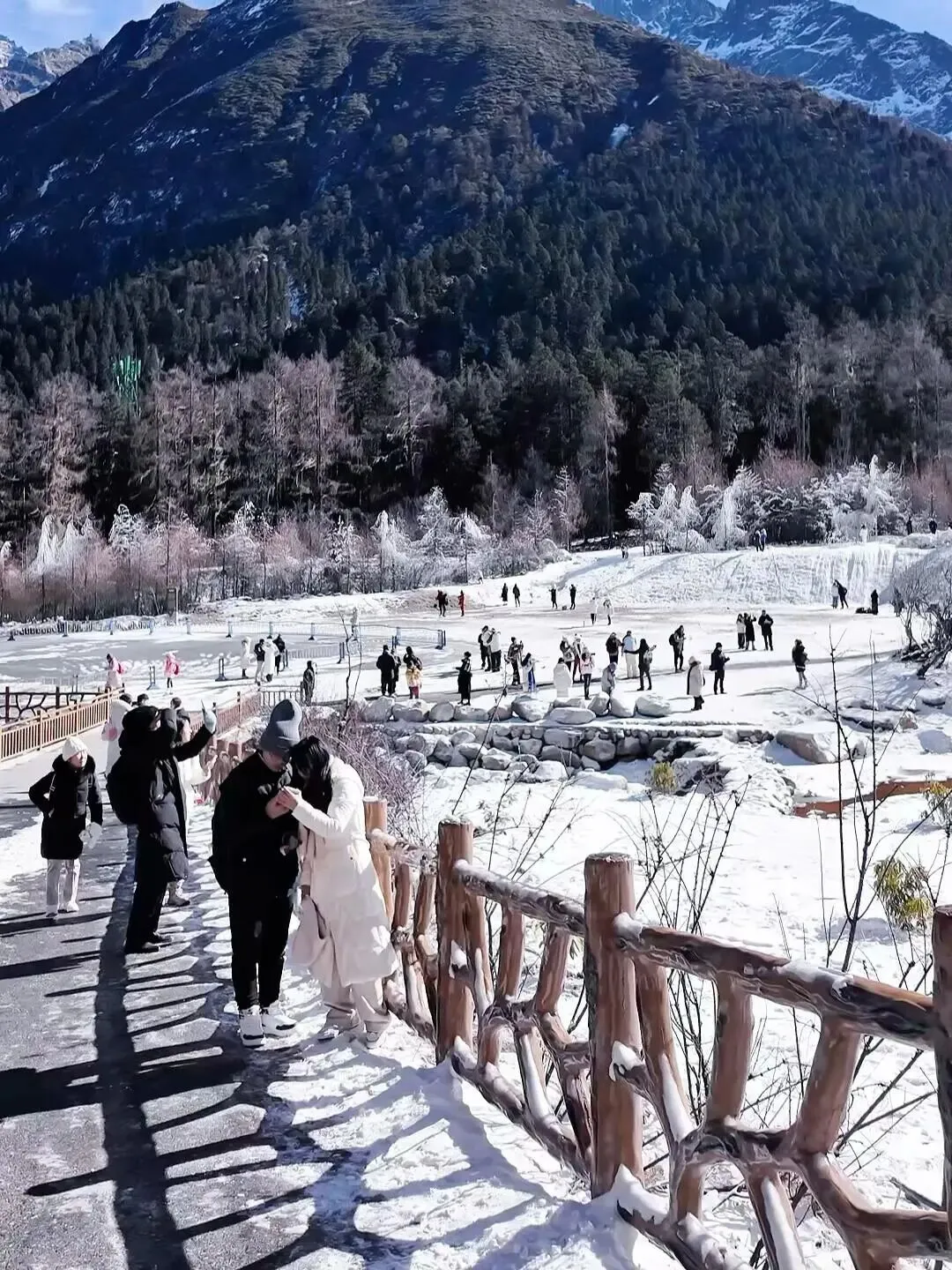 2. 月亮湖:藏着一个小型滑雪场,想玩雪的宝子可以冲!重点是左侧路道边,简直是拍照神机位,雪山作背景,怎么拍都好看。