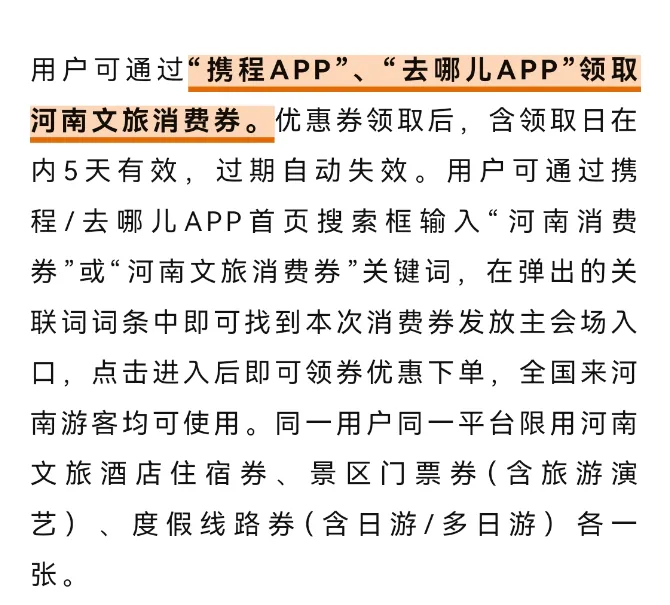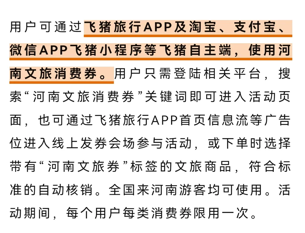 发放期间,在发放平台设置专属线上“河南文旅消费券”活动页面,用户在平台搜索“河南文旅消费券”,进入活动页面点击“领取”按钮即可获得酒店住宿、景区门票及演出、跟团线路的河南文旅消费券。消费券自动放入用户账户,消费者支付订单时按折扣补贴对应的金额进行自动扣减。用户在平台内挑选指定产品并下单,立即享受折扣补贴,每笔消费限用一张消费券。