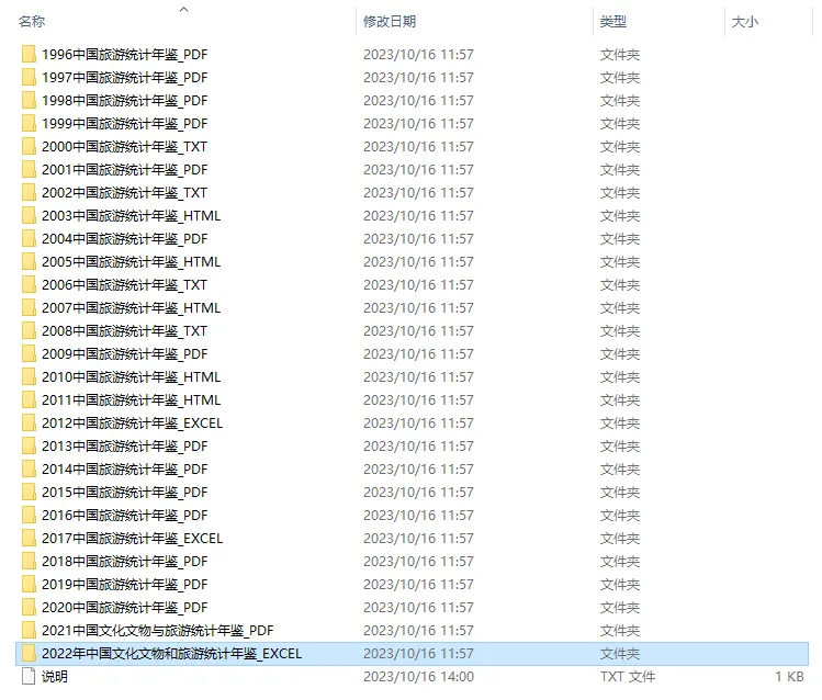 本次分享数据涵盖了1996年到2022年的中国旅游统计年鉴,具体年鉴格式件如下截图。
