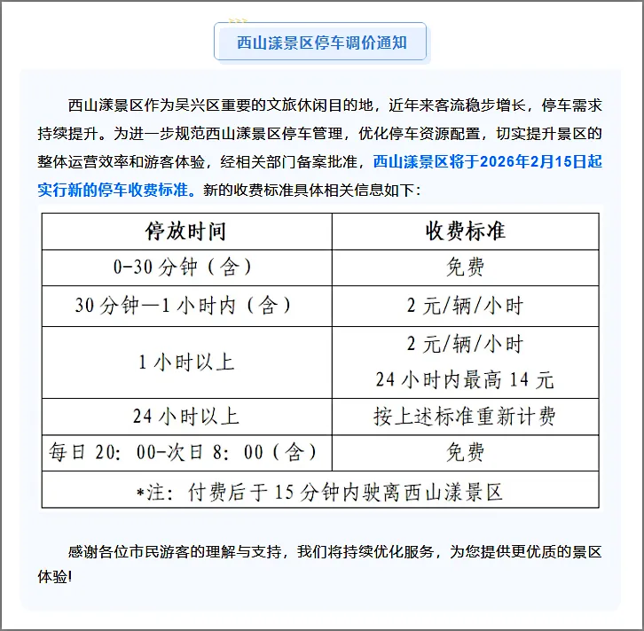 据通知,西山漾景区作为吴兴区重要的文旅休闲目的地,近年来客流稳步增长,停车需求持续提升。为进一步规范西山漾景区停车管理,优化停车资源配置,切实提升景区的整体运营效率和游客体验,经相关部门备案批准,西山漾景区将于2026年2月15日起实行新的停车收费标准。