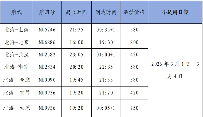 3.适用行程:适用于乘坐东航北海始发国内单程航班