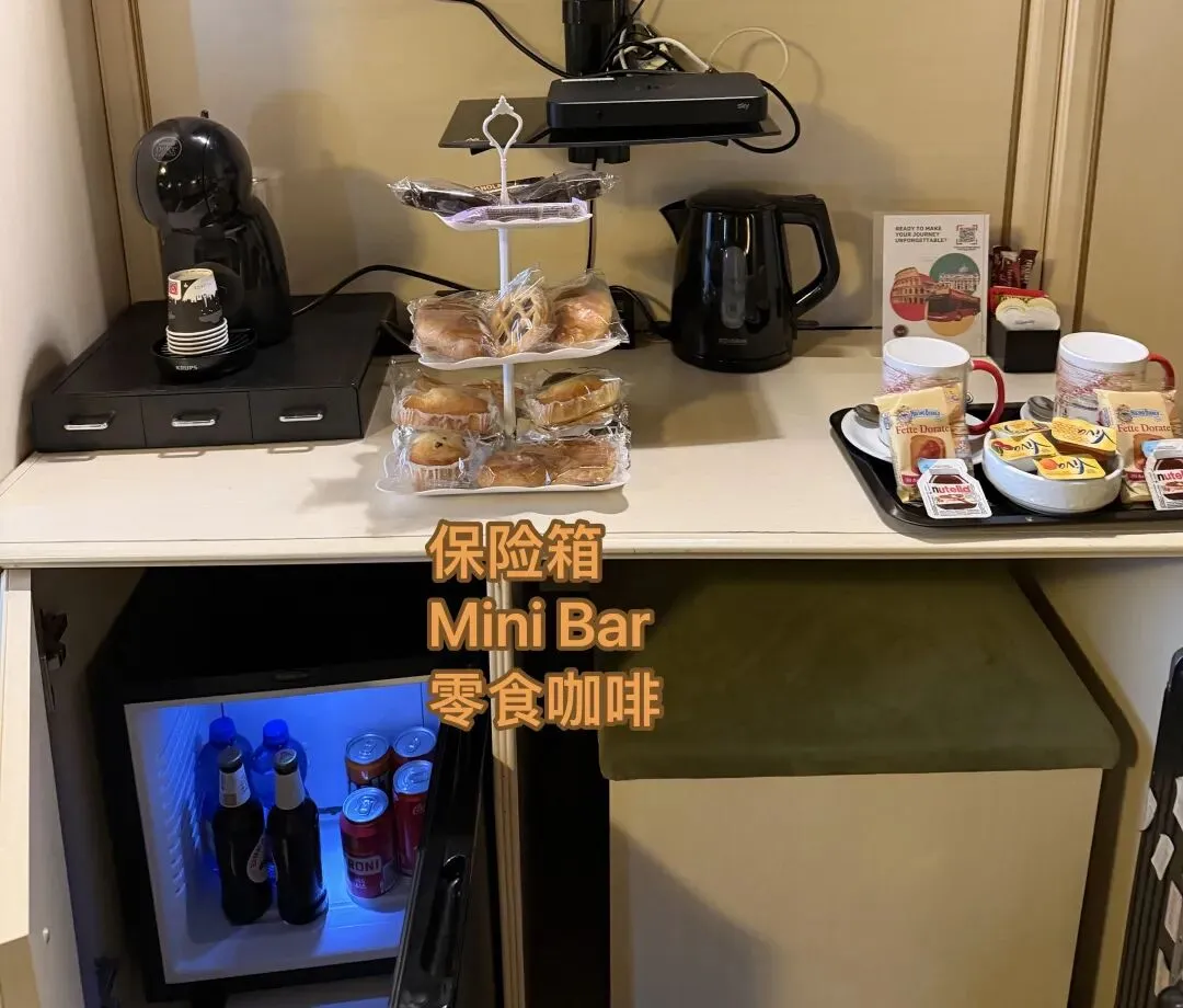 这次我订的罗马酒店住三天均价800一晚,三天花了2000来块,这只够旺季来住一天。这个酒店楼下就有超好的景观、旁边就是人民广场和西班牙广场、楼下还有四百多年历史的狒狒喷泉、罗马雕像最多的咖啡厅、房间内房间的mini bar,snack box,咖啡机、两层安保、还有,谁懂房间带保险箱的含金量啊!我下次来罗马一定还住这里!!