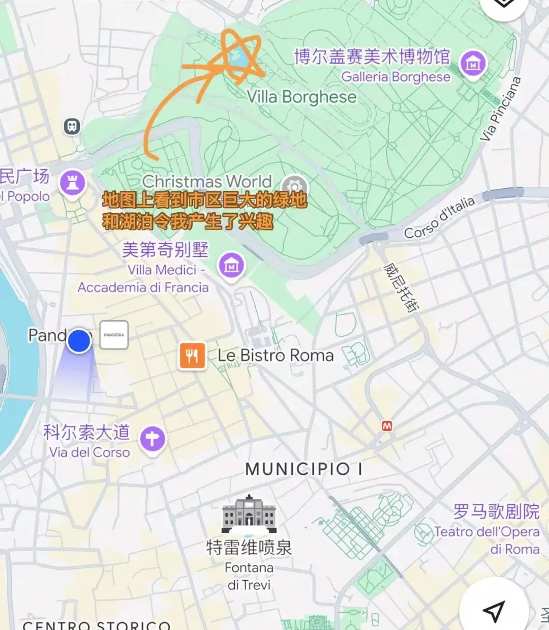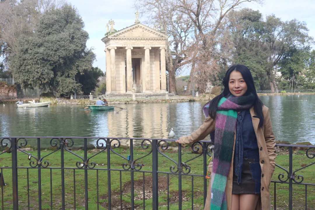 第二天早上,想着罗马最近只有半天晴,一大早就出发了,我看到谷歌地图上标注了一个带湖的公园,湖心有座希腊风格的神庙,那叫一个兴奋,带上酒、薅上卫老师就出发。