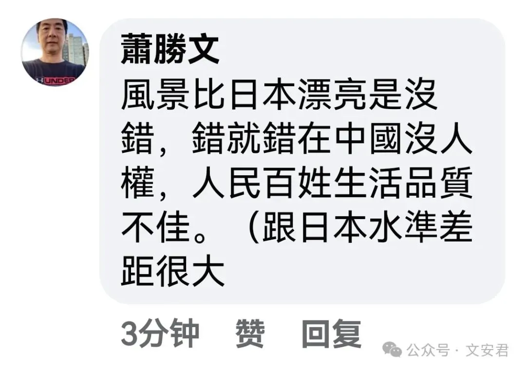 他说:“他只是说了大陆的事实和真实情况而已!如果说实话就叫帮大陆洗白,那这些躲在信息茧房的台湾人得有多无知多脆弱!”