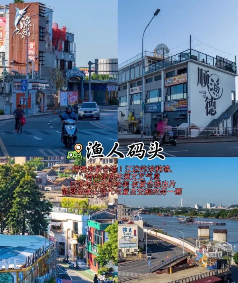 傍晚时分最是迷人!江边涂鸦墙与复古建筑交织,日落光影洒满河面,夜景如星河璀璨,是现代佛山的诗意缩影。