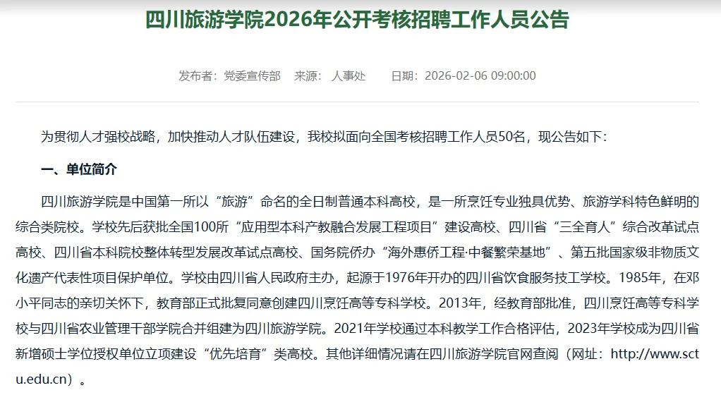 招聘50名,四川旅游学院2026年公开考核招聘工作人员公告