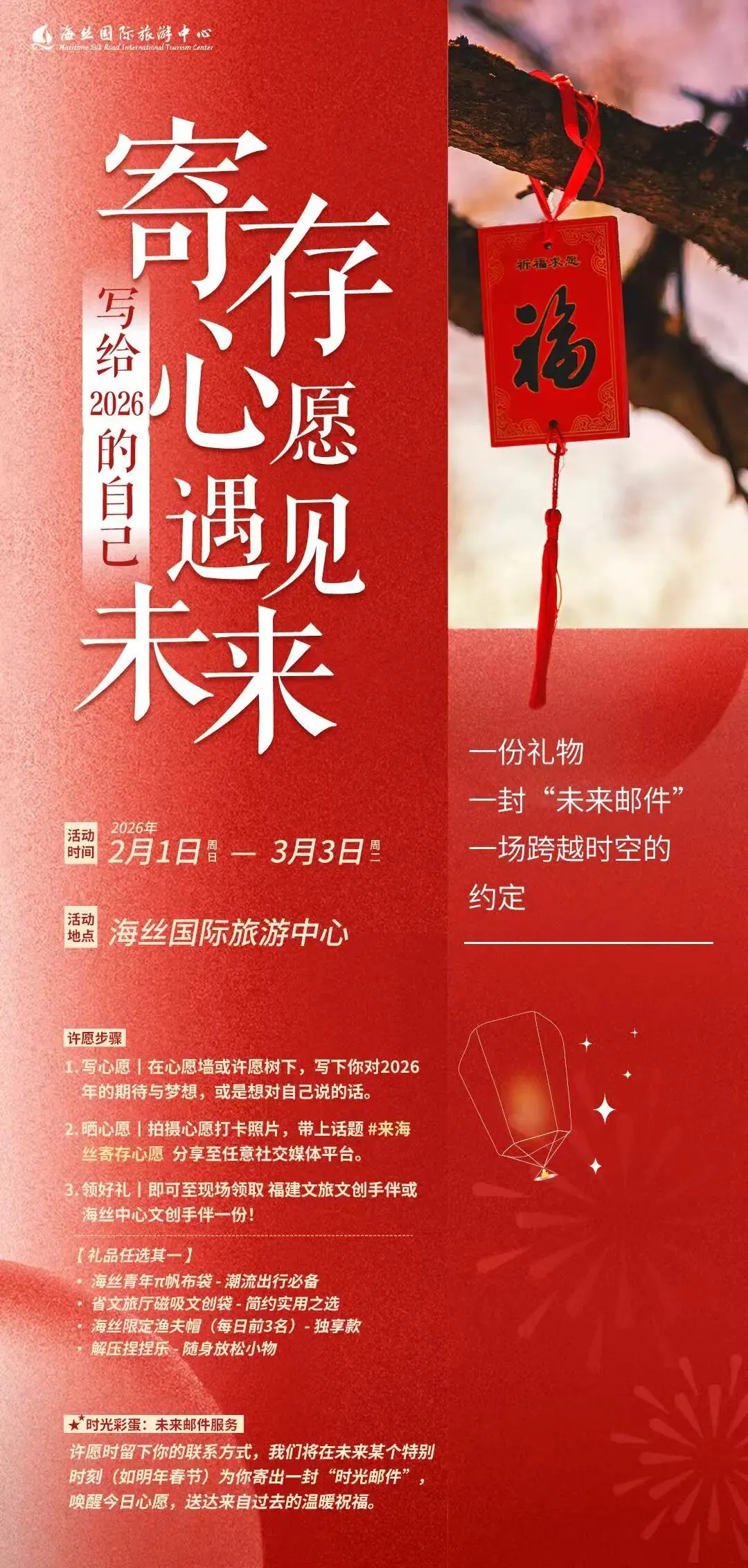 活动简介:「寄存心愿,遇见未来」新春许愿活动正在海丝国际旅游中心温情开展。你可前来写下对2026年的期许或给自己的一封信,打卡分享即可免费领取福建文旅或海丝中心文创好礼。现场还设有“未来邮寄”服务,我们将在未来特别时刻将你的心愿以邮件寄回,让今日的期盼成为明日温暖的惊喜。