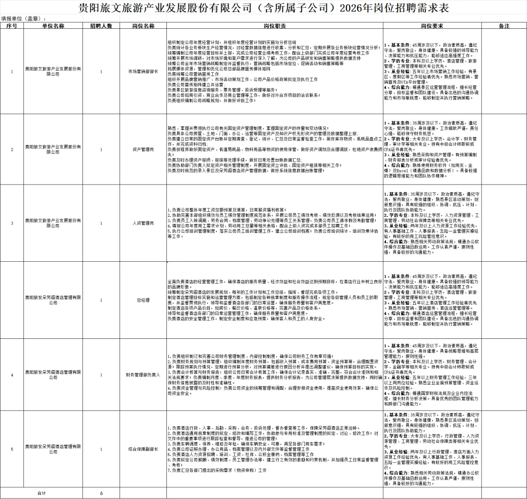 【贵阳】招6人,贵阳旅文旅游产业发展股份有限公司招聘公告(2月28日截止)