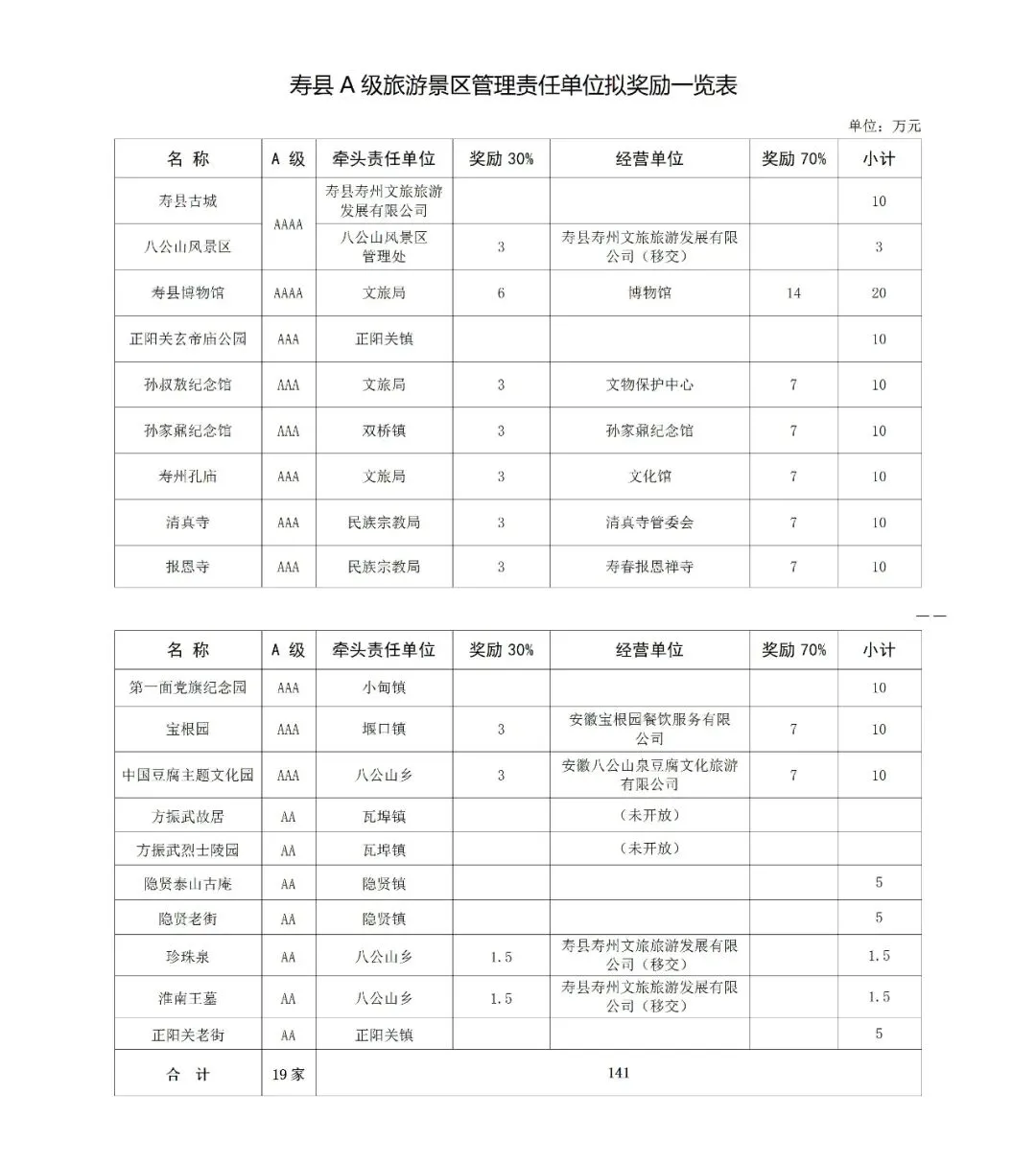 寿县A级旅游景区管理责任单位拟奖励一览表