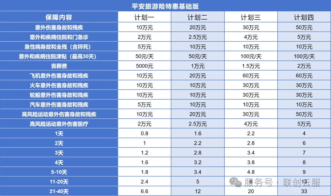 20日深度游:保费2.4元起(计划一)。(更高计划的详细费率请参照表格或咨询顾问,计划四最长40天保费为33元。)