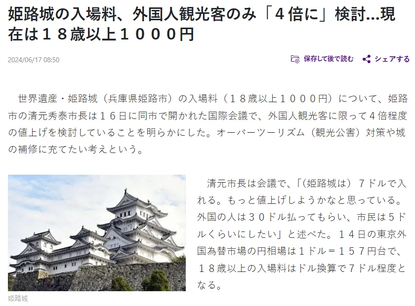 其中,姬路城备受关注:自今年3月1日起,非姬路市市民的门票价格从1000日元涨至2500日元(涨幅2.5倍),而姬路市本地市民仍可按原价购买。