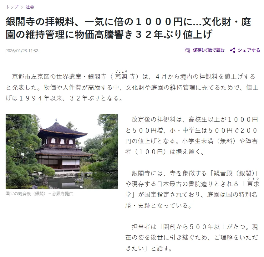 此外,银阁寺和犬山城也确定涨价:银阁寺自4月1日起,门票从500日元上调至1000日元;犬山城自3月起,成人门票从550日元涨至1000日元。