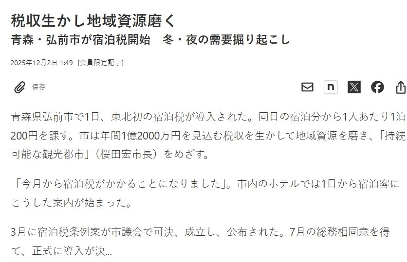 随着日本旅游回暖、游客增多,更多热门地区开始跟进:如去年12月,青森县的弘前市正式开始征收宿泊税,标准为每人每晚200日元。虽然金额不高,但叠加其他费用,也是一笔额外支出。 按照这一趋势,未来可能有更多日本地区加入宿泊税征收行列,对于计划在日本多住几晚、多逛几个城市的游客来说,这部分额外开销需提前纳入预算。 总体来看,当前赴日旅游已不再是性价比偏高的选择。继签证政策调整后,门票(普涨+拟双重定价)、住宿税(扩围)全面涨价,多重因素叠加导致赴日旅游整体成本显著上升。